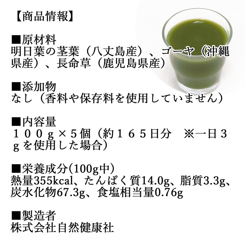 - Ingredients: Asaha (from Hayajima), Goya (from Okinawa), Long Life Plant (from Kagoshima)