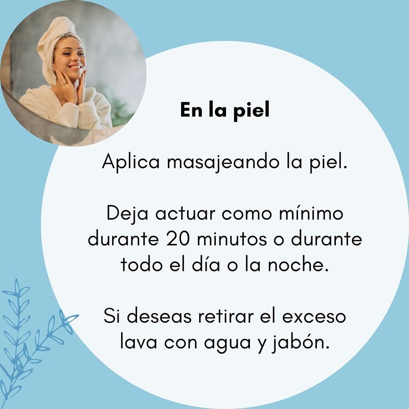 - En la piel: Puede mezclarse con cremas, bálsamos, pomadas, geles corporales, cremas y aceites para masaje. Puede usarse en productos para antes y después de exponerse al sol. Puede usarse en formulaciones para pieles sensibles y delicadas. Calma la comexón y piel irritada. Nutre, fortalece, humecta, suaviza y repara la piel seca. Calma y refresca la piel después de rasurarse y al exponerse al sol. Limpia la grasa. Limpiador, desmaquillante y exfoliante. Conserva la piel sana y hermosa.