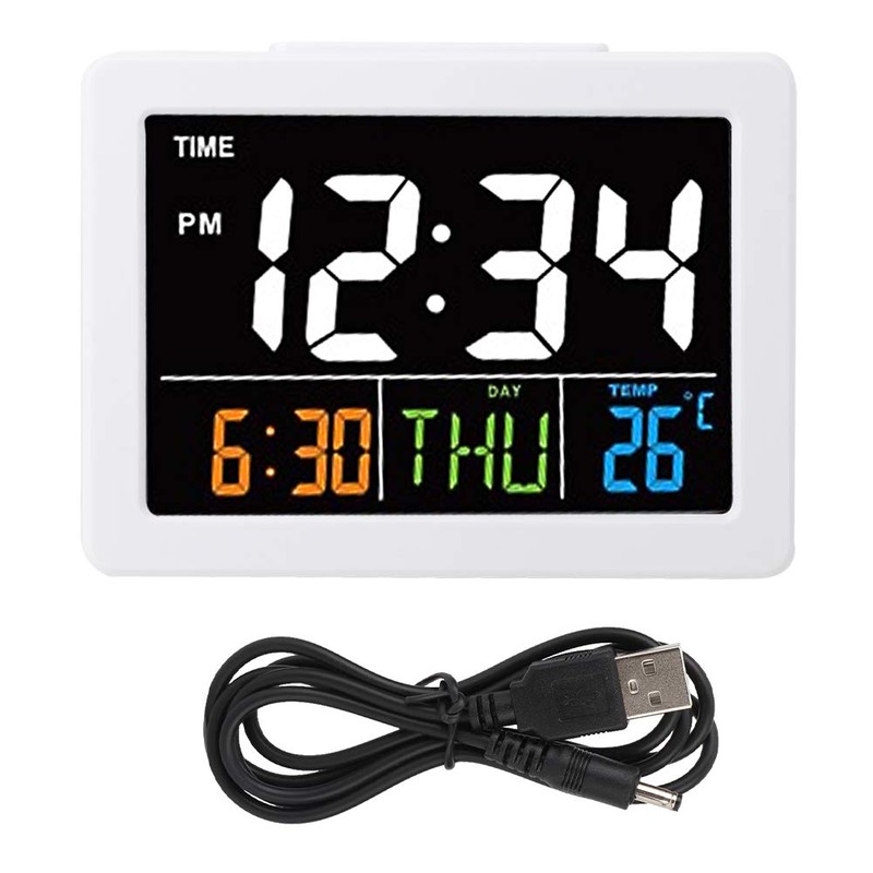 Natudeco Digital Alarm Clock Colorful Large Screen LCD Electronic Desk Bedside Clock LED Clock with Temperature Date Display (white)