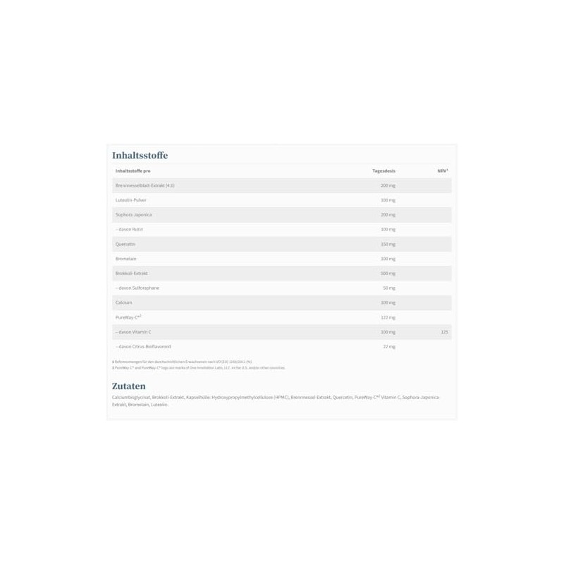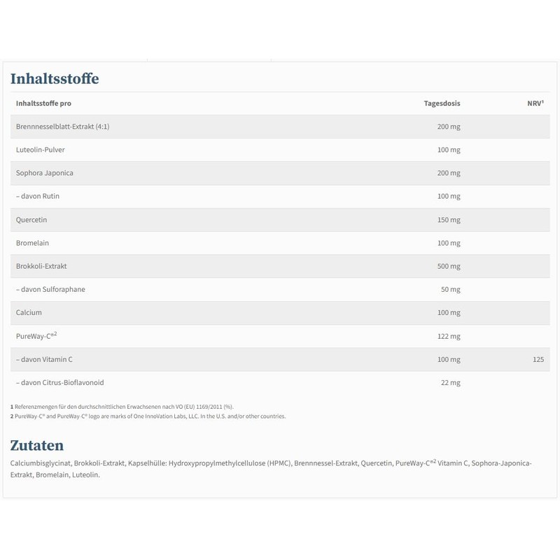 - ✔ High-quality complex of plant enzymes such as luteolin and bromelain and secondary plant substances such as rutin, quercetin and sulforaphane. Rutin and quercetin come from the Japanese string tree.