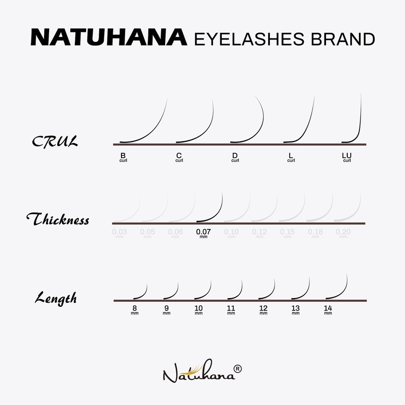- Specifications: Unchanged curve: C/D curl, thickness: 0.07 mm, length: 8-14 mm mixed in one tray. 12 rows/case, including: 8 mm x 1.9 mm x 2.10 mm x 2.11 mm x 2.12 mm x 2.13 mm x 2.14 mm x 1. A tray can meet your desired needs for flawless and natural appearance fulfilment.