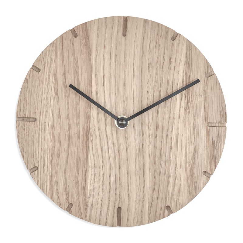 Solid Mini. Distinctive Solid The latest model from Natuhr is the perfect symbiosis between modernity and nature. Between purism and extravagance. Between functionality and aesthetics. Solidly built from natural untreated oak wood. Distinctive thanks to the structure and design. Solid due to the depth of 2.5 cm. Solid Mini is more than a wall clock. It is a piece of real nature for home. A tribute to the preciousness of time. To the transience. The simple solid oak design is only interrupted by the precisely milled minute and hour strokes. In the foreground is the wood. The fine structure. Each model is unique. Just as each tree is unique. On the functional side, U.T.S. Movements, made in Germany, highest comfort. They are silent and ensure that absolutely no annoying ticking is heard.