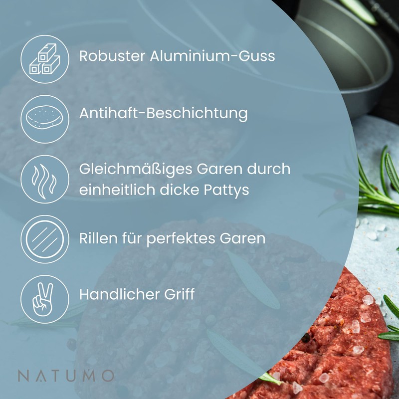 NATUMO Burger Press Set of Hamburger Press and Burger Paper (50 x Release Paper), Burger Maker Made of Cast Aluminium (Diameter 11 cm, 200 g), Professional Burger Pattie Press with Non-Stick Coating