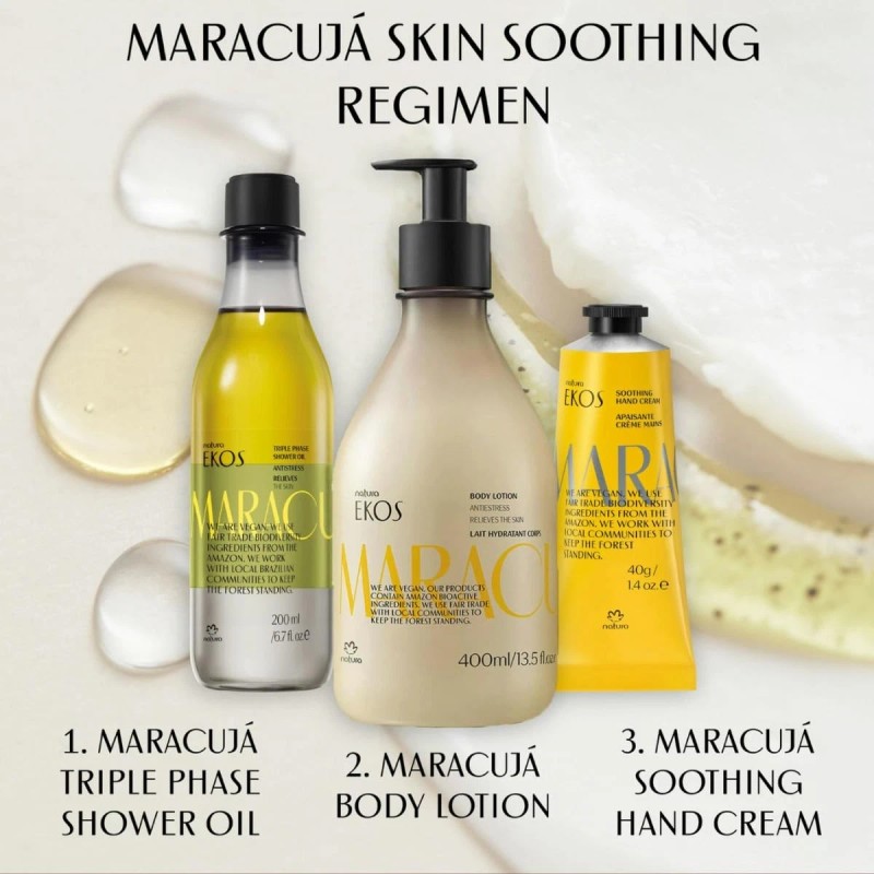 - Maracujá Skin Hydration Regimen - 1. Form a protective layer on the skin with Maracujá Triple Phase Shower Oil. 2. Calm and moisturize skin with Maracujá Body Lotion. 3. Soothe hands for up to 24 hours with Maracujá Hand Cream.