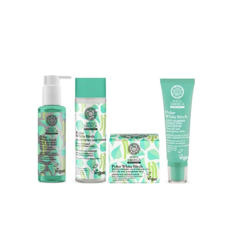 Natura Siberica Clear Beauty Polar White Birch Bereza Pore Refining Face Cleanser for Oily & Acne Prone Skin, 145ml & Clarifying Face Toner, 200ml & Moisturizing Face Cream, 50ml & Anti Blemish Correcting Serum, 30ml