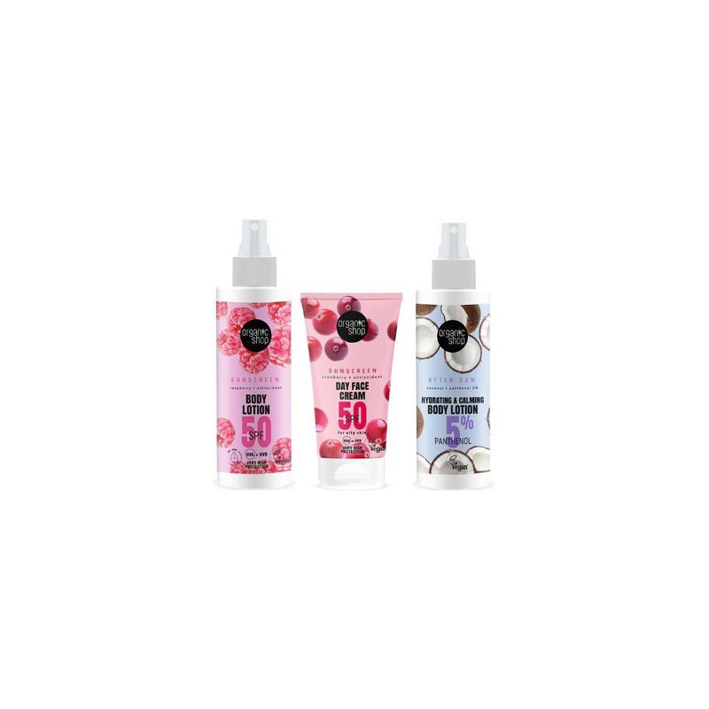 Natura Siberica Sun Fun 1 Sunscreen Body Lotion Raspberry & Antioxidant Body Lorion SPF50, 150ml & Sunscreen Day Face Cream SPF50 for Oily Skin, 50ml & Hydrating & Calming After Sun Body Lotion with Coconut & Panthenol 5%, 150ml
