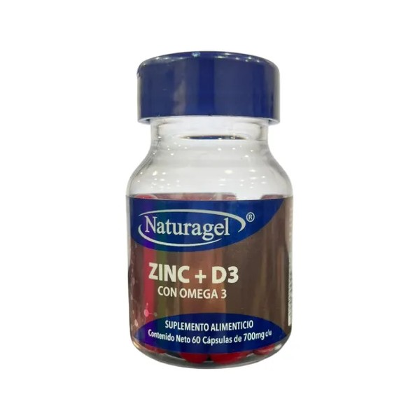 Naturagel Zinc con Vitamina D3 y Omega 3 es un suplemento nutricional formulado para ofrecer múltiples beneficios para la salud. Cada cápsula de 700 mg contiene una combinación poderosa de zinc, vitamina D3 y ácidos grasos omega 3, elementos esenciales que trabajan en sinergia para apoyar diversos aspectos del bienestar general.