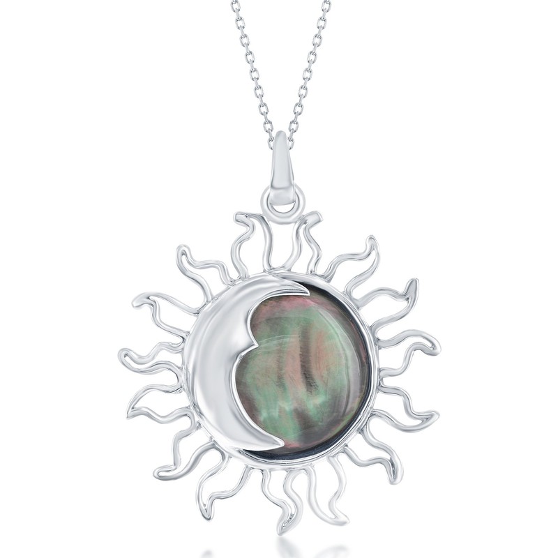 - Make this beautiful abalone sun and moon/ solar eclipse design pendant necklace an addition to you’re your jewelry collection. This pendant comes with a thick 18 inch rolo chain and secures with a lobster claw clasp.