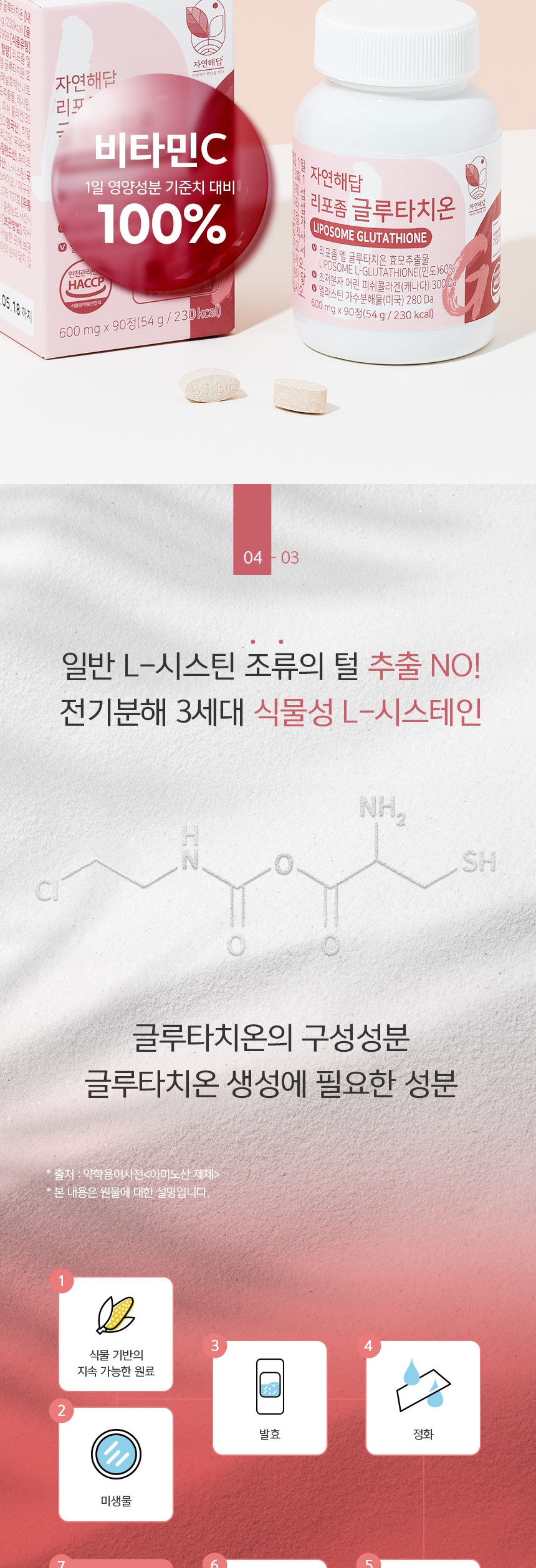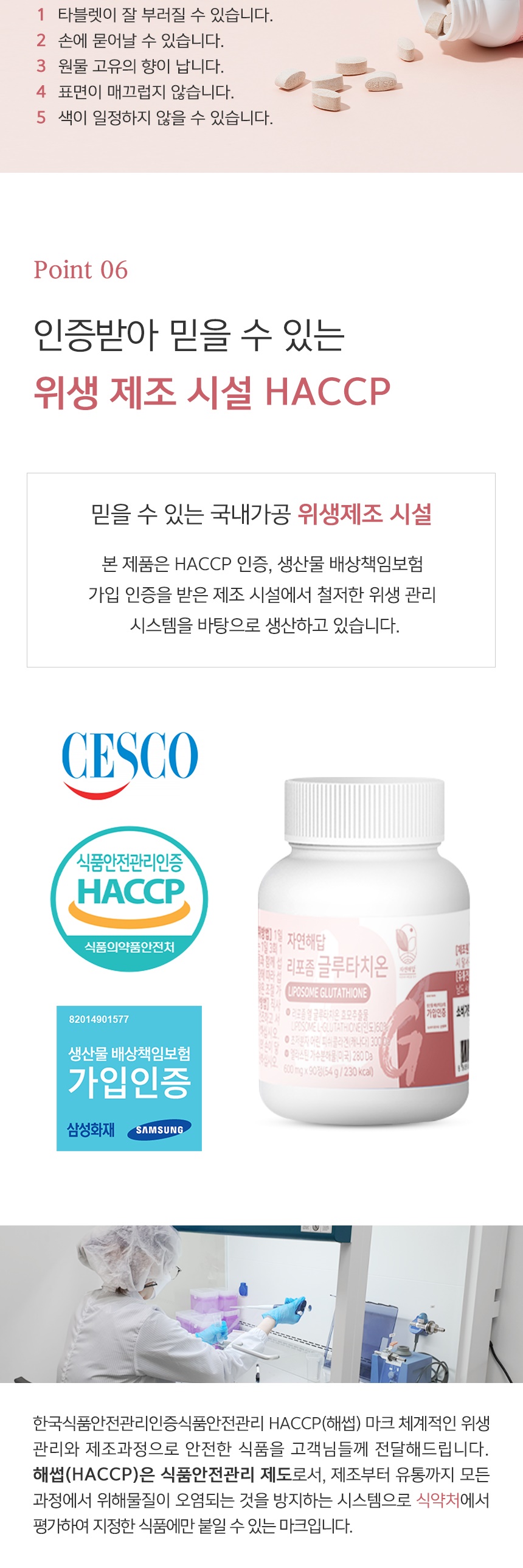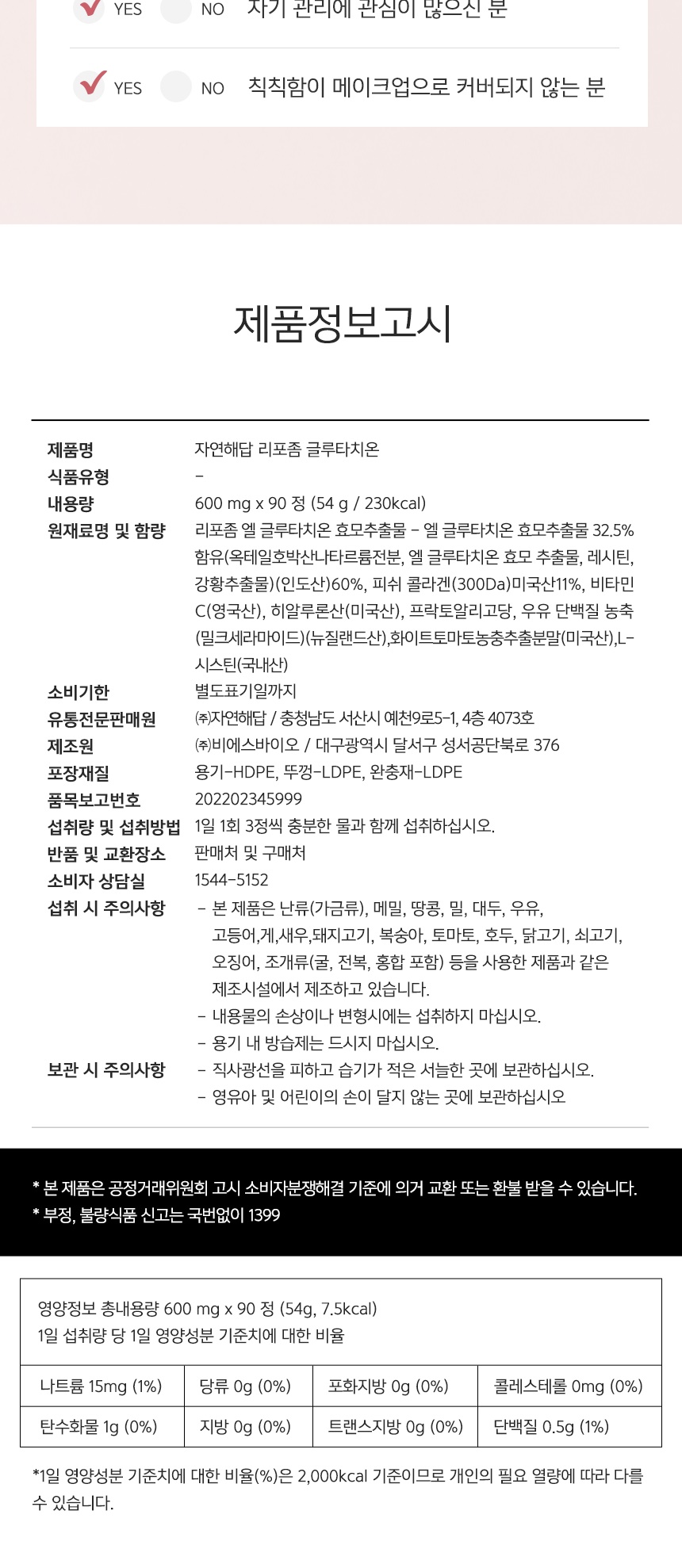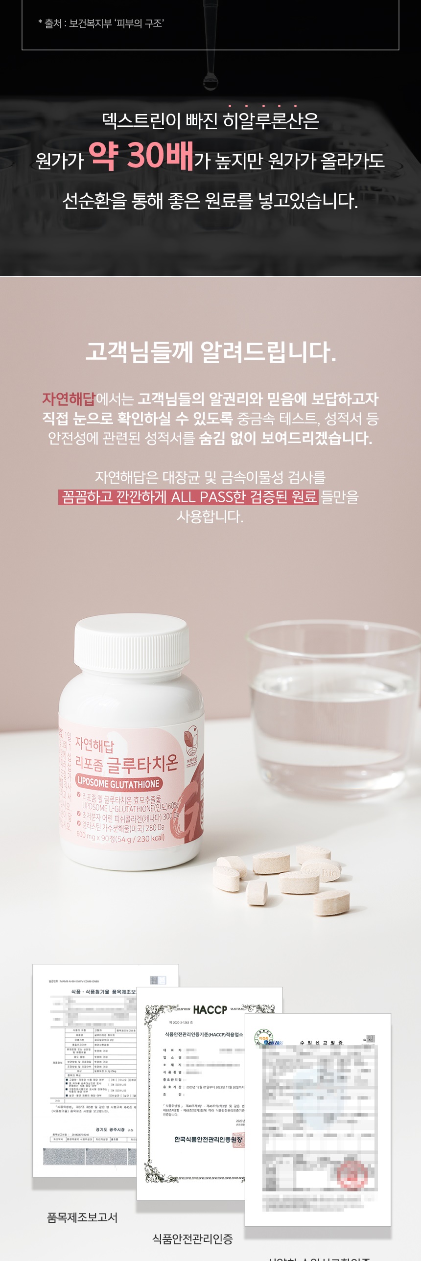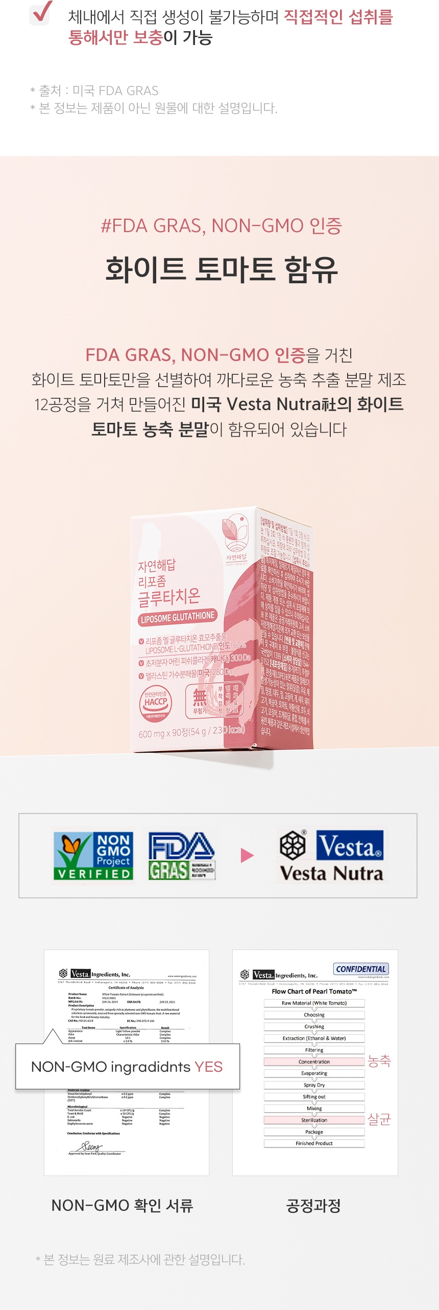 - Name and content of raw materials: liposome L-glutathione yeast extract 32.5%, (sodium octenyl succinate starch, L-glutathione yeast extract, lecithin, turmeric extract) (Indian product) 60%, fish collagen (300Da) (USA product), fructose Oligosaccharides, milk protein concentrate (milk ceramide) (made in New Zealand), white tomato concentrated extract powder (made in the United States), L-cystine (made in Korea)
