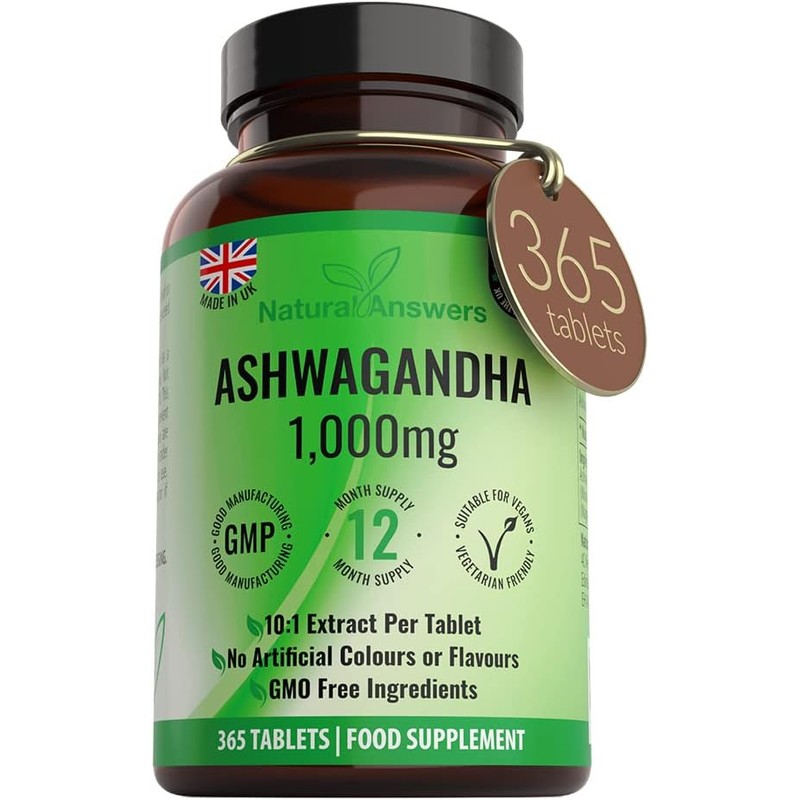 Natural Answers Ashwagandha 1000mg Tablets | 365 Vegan Tablets for 1 Year Supply | High-Strength Pure Ashwagandha Powder | Anxiety & Stress Support | UK-Made, Not Capsules or Pills