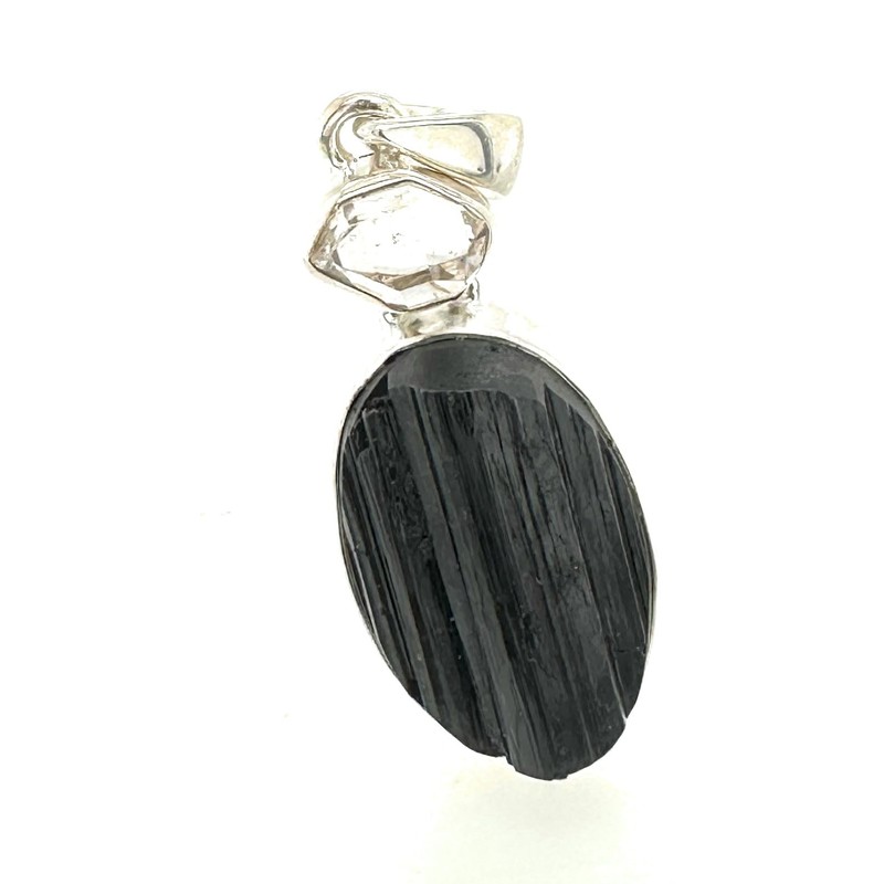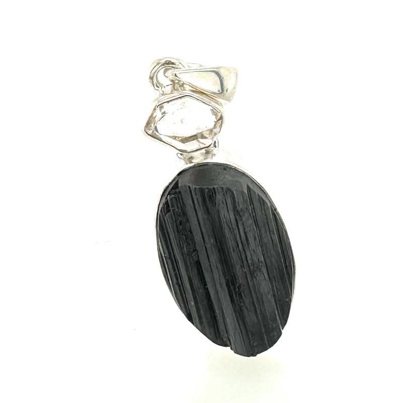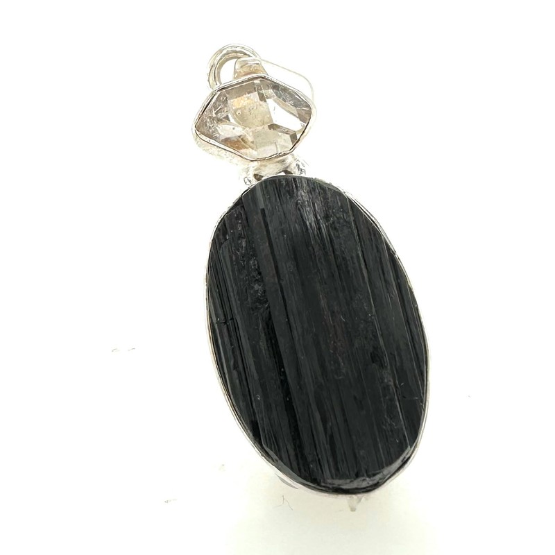 Natural Black Tourmaline, Herkimer Diamond 925 Solid Sterling Silver Pendant 45mm