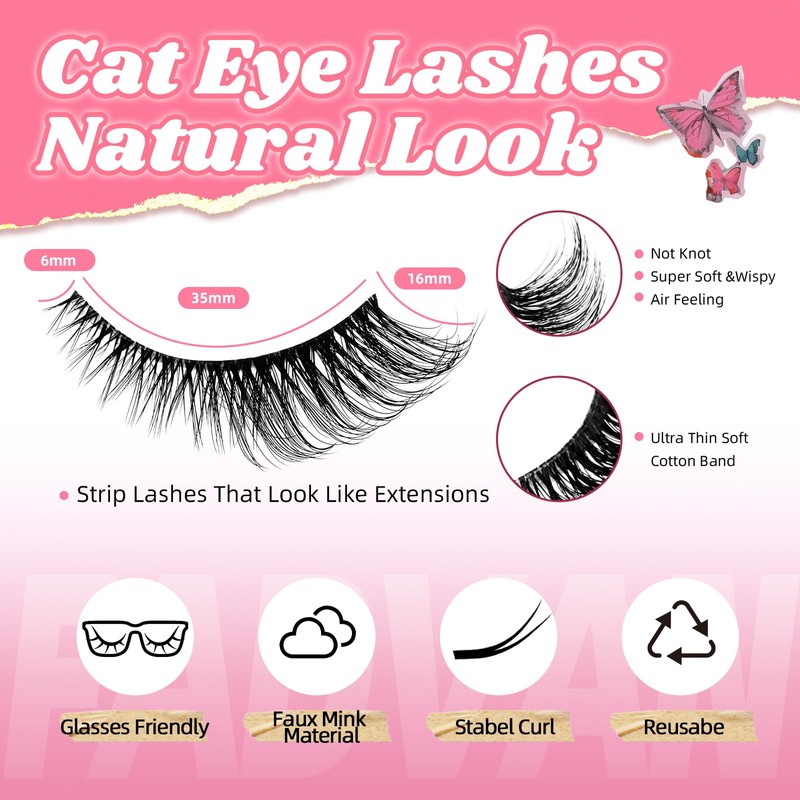 - Natural Cat Eye Lashes: FADVAN wispy lashes feature extended outer corners that elongate and lift your eye shape, while the fine yet subtle middle lashes provide a natural yet dazzling look. The flexible design allows you to trim the lashes to perfectly fit your eyelids.
