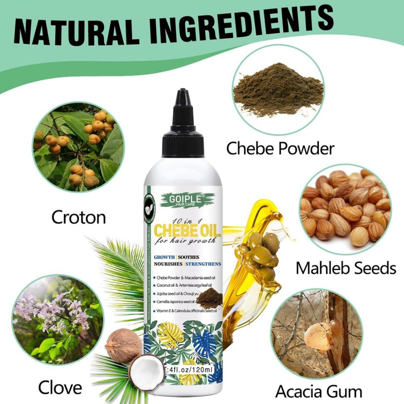 Pure Natural Chebe Hair Oil: Our 10-in-1 Chebe and Rosemary oil hydrates and lubricates your hair, making it soft and manageable. This high-quality hair growth oil helps lock in moisture, improves dry and brittle hair, and promotes healthy hair growth.