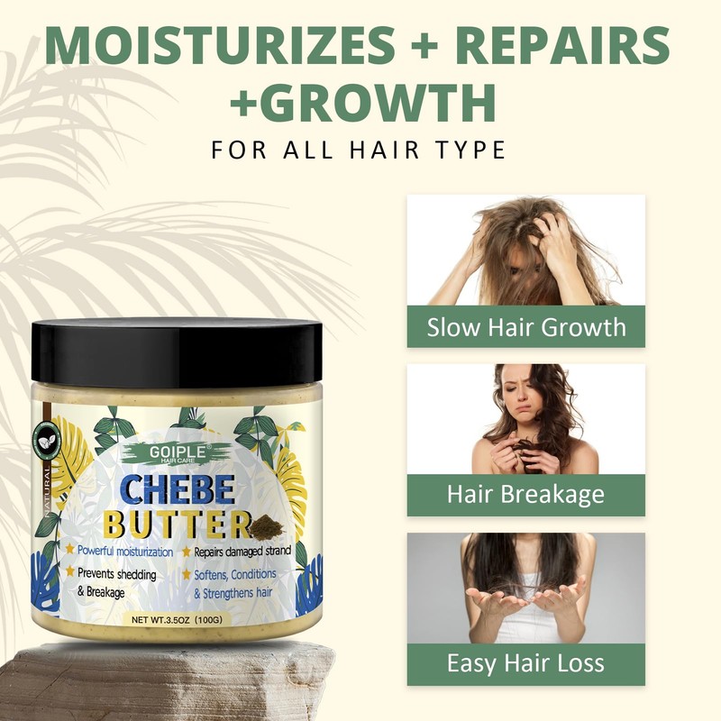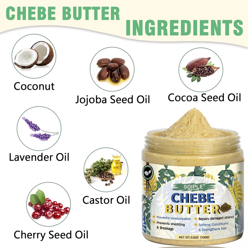 Chebe Nourishing Set: Our Chebe moisturizing set includes 1 bottle of 4 oz Chebe oil, 1 jar of 3.5 oz Chebe butter, and 1 braided satin sleep cap. This set not only strengthens your hair but also repairs damaged strands.