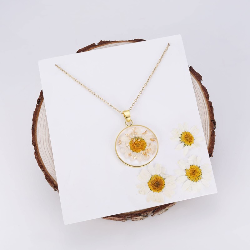 - Pendant Detail: Handmade item;Pendant height: 2.8 Centimeters; Pendant width: 2.8 Centimeters;Materials: 18K Gold Plated over brass,Daisy flower, resin,gold flakes.Chain Detail:Stainless Gold Plated 18 inches and is perfect for everyday wear.