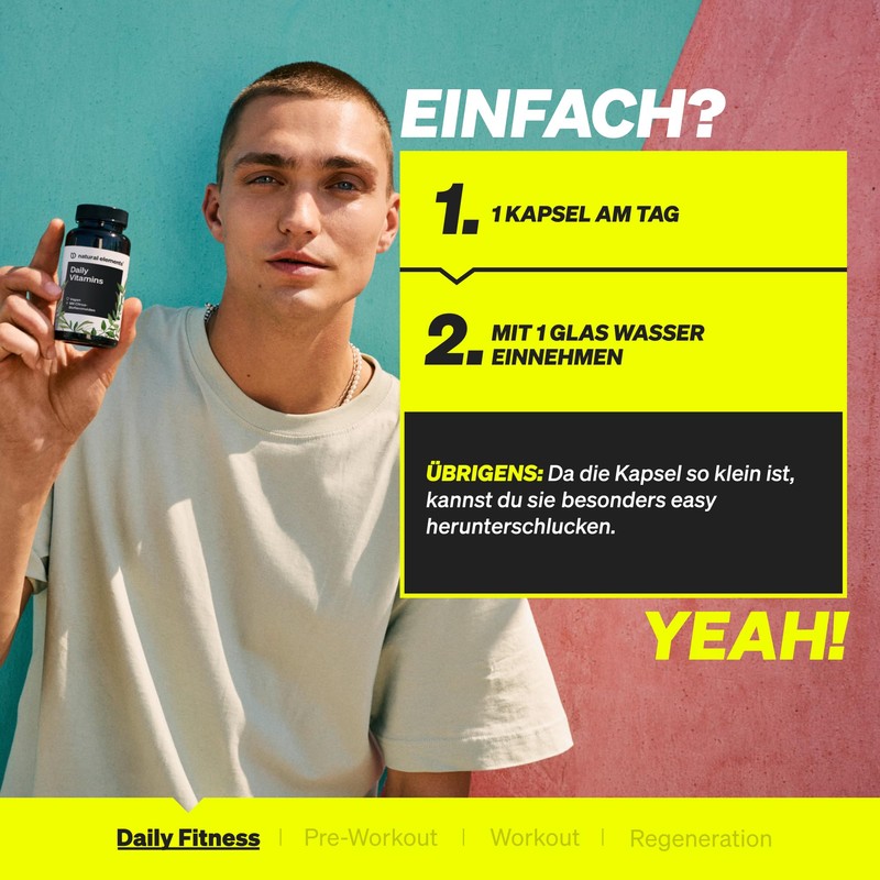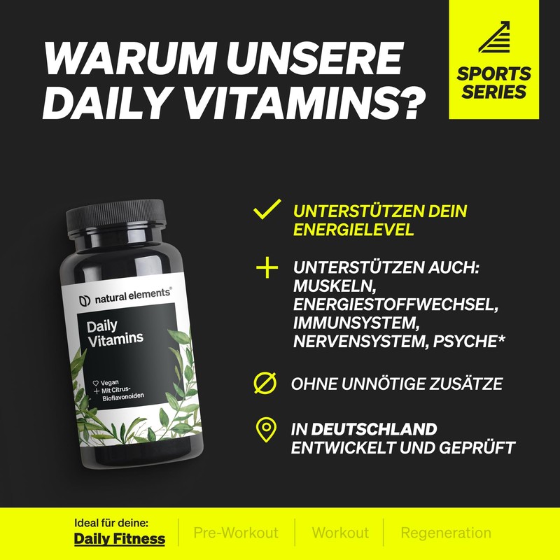 - DEIN SPORTLICHER VITAMIN-MIX | Wer seinen Körper fordert, sollte ihm etwas zurückgeben. Hier kommen unsere Daily Vitamins ins Spiel: mit 13 Vitalstoffen für u.a. für Energiestoffwechsel, Muskeln sowie Immun- & Nervensystem und wertvollen Bioflavonoiden.*