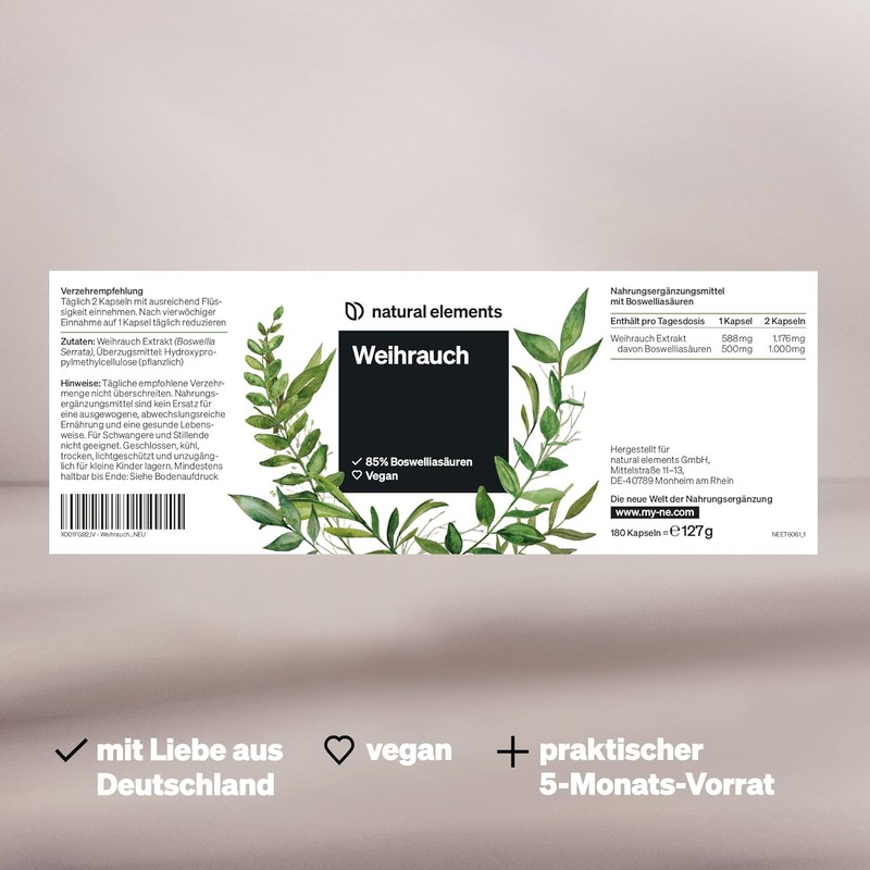 natural elements Frankincense Capsules - 1176mg Extract from Indian Frankincense - 85% Boswellic Acids - High Dose & Vegan - Supply for 5 Months - Produced & Laboratory Tested in Germany