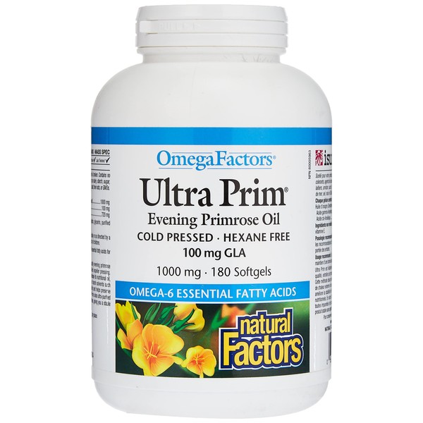 Primrose oil is naturally high in gamma-linolenic acid (GLA), an omega-6 essential fatty acid which offers many important health benefits. Ultra Prim from Natural Factors contains 1000 mg of naturally cold pressed pure evening primrose oil, free of solvents and residues. Containing 100 mg of GLA per capsule, Ultra Prim is often used therapeutically for menopausal symptoms such as hot flashes and PMS. Evening Primrose Oil may also offer benefits to those concerned with high cholesterol or blood pressure, pain, inflammation and more. LARGER, MONEY SAVING 180 CAP BOTTLE!