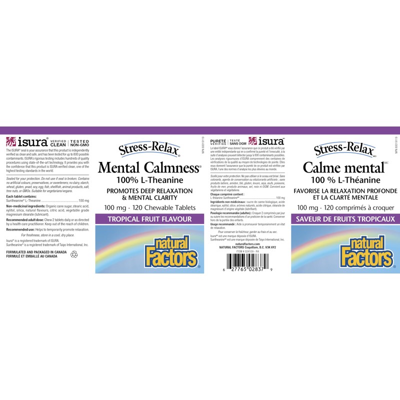 Natural Factors Natural Factors Stress-Relax Mental Calmness, 120 Chewable Tablets, Tropical Fruit Flavour, Suntheanine® L-Theanine 100 mg, Promotes Deep Relaxation and Mental Clarity, Proudly Canadian