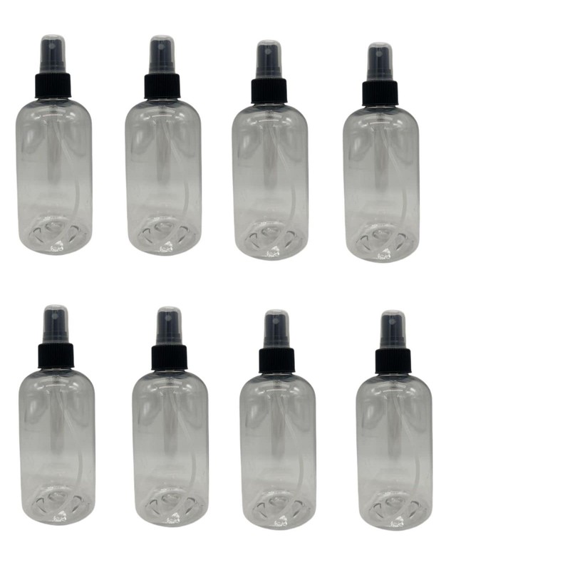 Natural Farms 8 oz Clear Boston BPA FREE Bottles - 8 Pack Empty Refillable Containers - Essential Oils Cleaning Products - Aromatherapy | Black Fine Mist Sprayers - Made in the USA