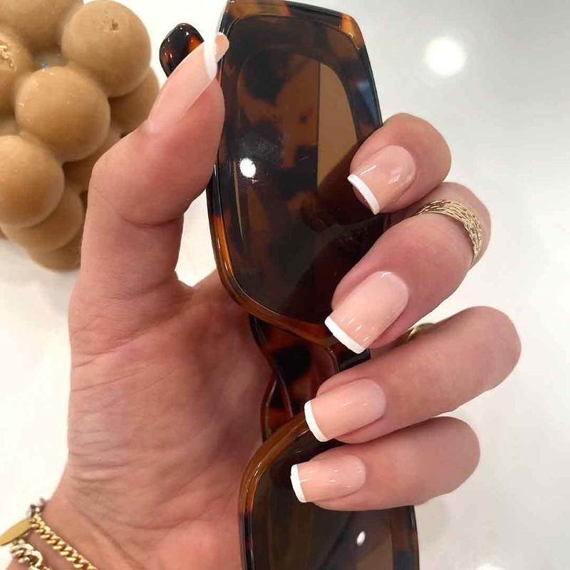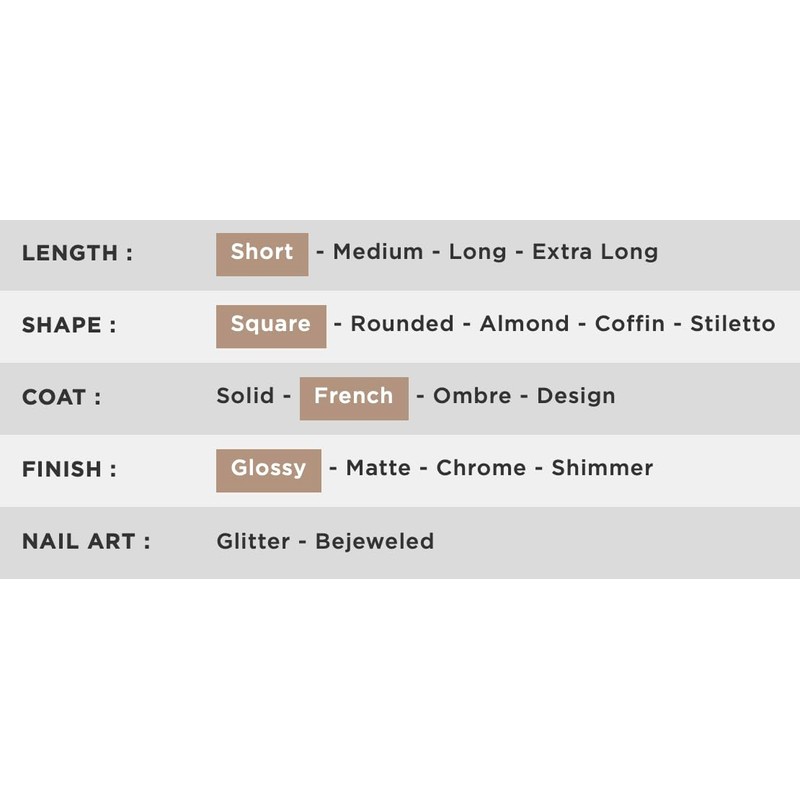 - Natural French Press-On Nails are Square-Shaped and Short in Length with a Thin French Tip.