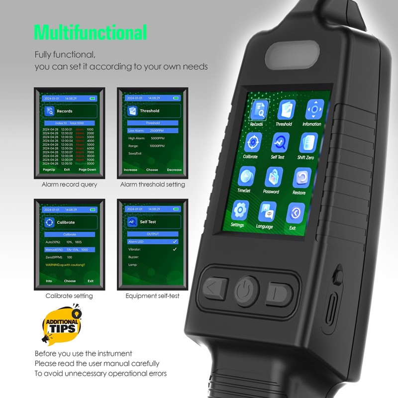 - 【Multiple Alarm Mode 】Simply turn on the gas leak detector and point to the suspected leak area. When a combustible gas leak is detected, the gas leak detector will immediately remind the user through (Sound, Alarm Light, Vibration) to ensure a response in the first time.