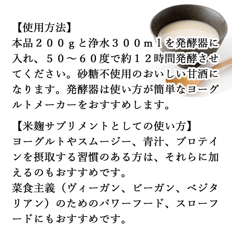 - [How to use] Japanese rice malt is made into fine powder. Fill this product with 7.1 oz (200 g) and 10.1 fl oz (300 ml) of water in your fermenter and ferment it for about 12 hours at 50 to 60 degrees. Sugar-free sweetener. Fermenters have rice cookers, thermos, etc., but we recommend a yogurt maker that is easy to set up