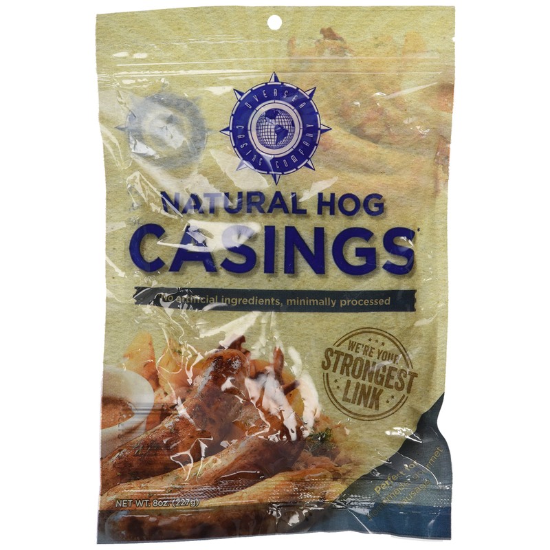 All natural, quality hog casings from North America, supplied by Oversea Casingl. For best results, do not freeze and use within one year. We recommend storing unopened product in a cool, dry place. After opening, re-pack unused casings in salt and refrigerate.