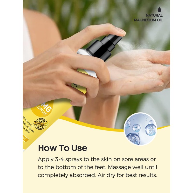 - Usage Instructions: Our Magnesium Spray features a new, advanced formula. Each spray delivers 25 milligrams of natural magnesium, suitable for 4-5 sprays on the skin or feet. Simply massage until fully absorbed.