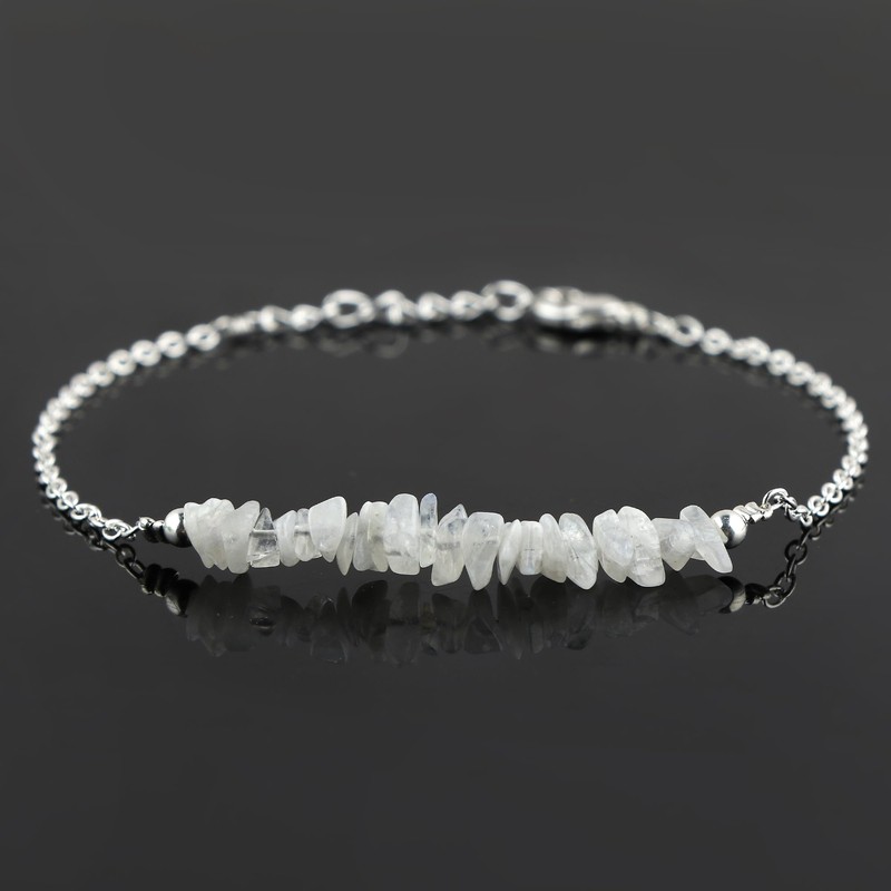 - Authentic Moonstone Chips: This bracelet is crafted from genuine moonstone chips, celebrated for their captivating adularescence that produces a beautiful glow of light, ranging from soft white to subtle hues of blue and gray, making it a stunning addition to any jewelry collection.