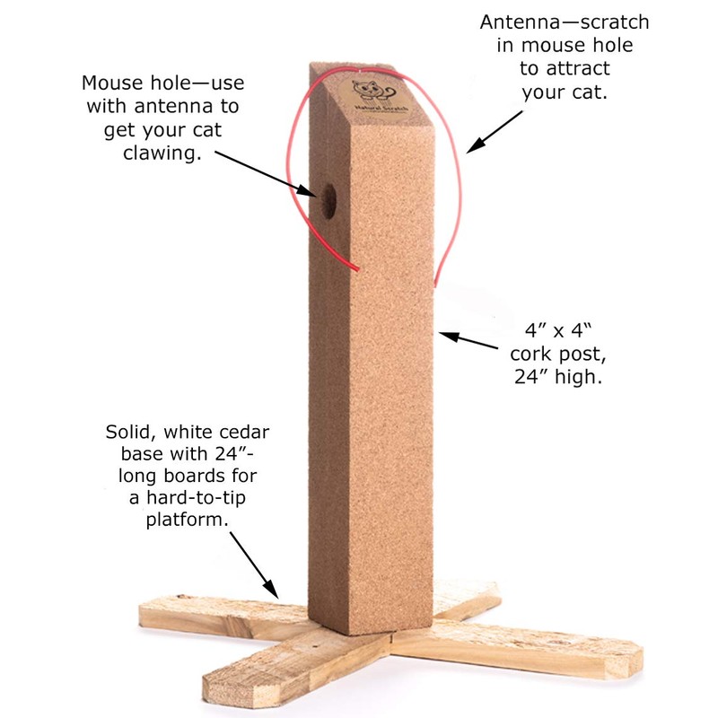 Features such as the bungee-cord Antenna and 1.5"-diameter Mouse Hole help customers interest cats in the post and encourage clawing. The free easy-to- read-and-use Training Your Cat to Claw Natural Scratch booklet teaches customers how to train their cats to claw Natural Scratch exclusively and includes tips on how to discourage inappropriate scratching.