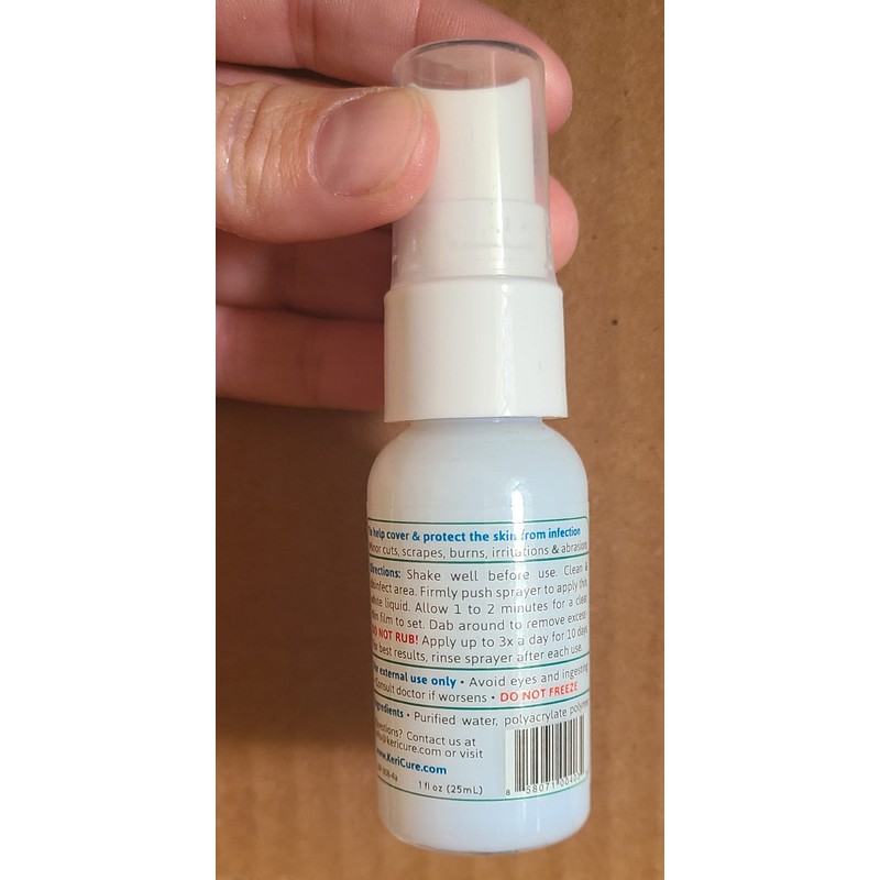 - KERICURE'S SPRAY ON LIQUID BANDAGE products for people and their pets are the FIRST to combine the natural healing powers of water with a highly elastic organic polymer barrier to soothe rashes and skin irritations while blocking dirt to protect your wounds.