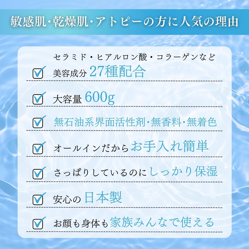 - This product was released in March 2025. This gel cream is made in Japan with a large capacity of 21.3 oz (600 g) that is gentle on the skin. This all-in-one gel cream contains 12 types of plant extracts, hyaluronic acid, collagen, and 27 types of beauty ingredients, including hydrolyzed silk, hydrolyzed eggshell membrane. Petroleum free surfactant, fragrance-free, color-free, alcohol-free and paraben-free, gentle on the skin and hypoallergenic, making it a popular product for people with sensitive skin. This is an all-in-one gel cream, so you can use it as a foundation for lotion, emulsion, serum, cream, pack, makeup and so on. This is a convenient cream that can be used not only on your face, but also on your body. Suitable for the whole family from kids to adults. Simple packaging, eco-friendly, no advertising, cost saving, and affordability. This product is made with high quality