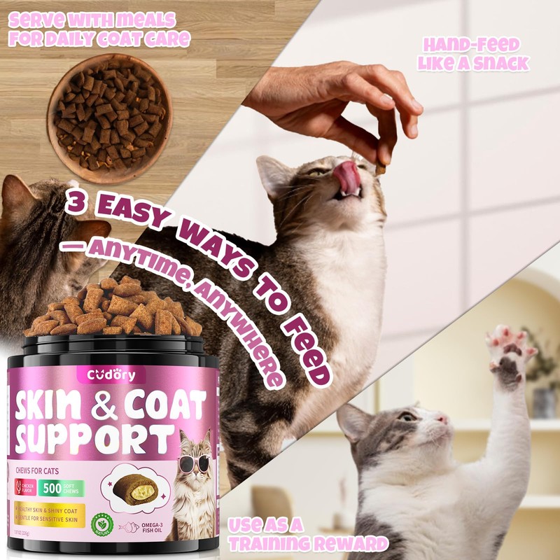 - Natural and High-Quality Ingredients – We use only premium ingredients to support your cat’s skin and coat health. These chews are made with natural sources such as deep sea fish oil, krill, and chicken liver powder, providing essential nutrients that help maintain healthy skin and a shiny coat.