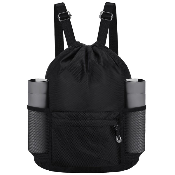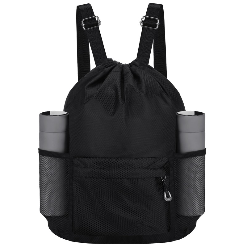 NATURAL STYLE Waterproof Drawstring Bag, Lightweight String Backpack with Water Bottle Holder and Pockets, Gym Sports Cinch Sackpack (Black)