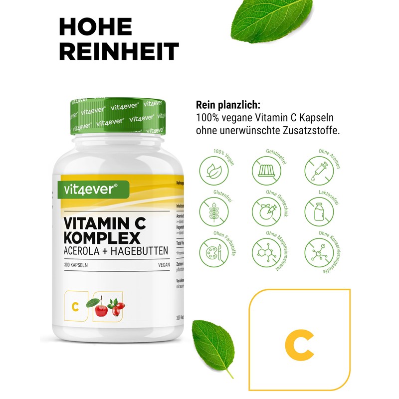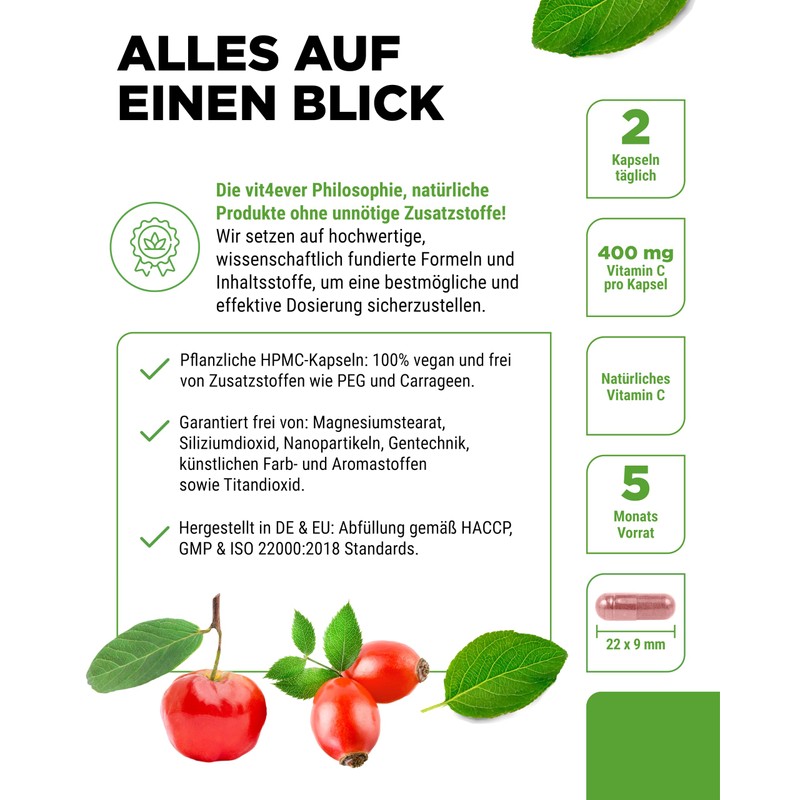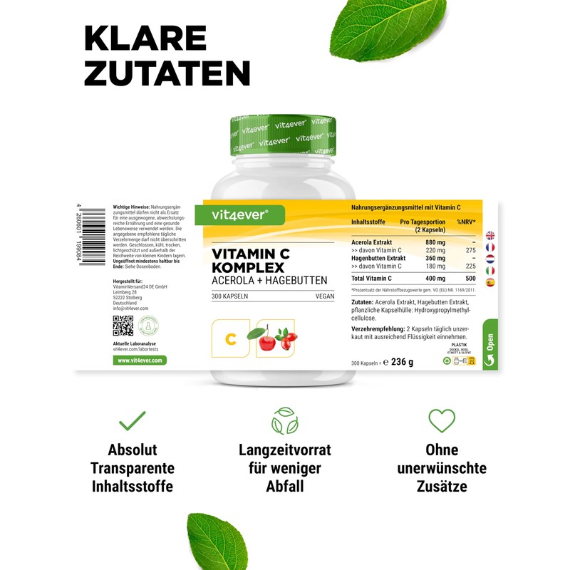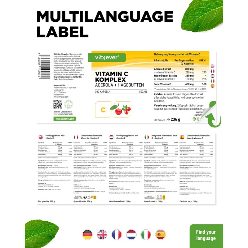 Natural Vitamin C Complex - 300 Capsules in 5 Month Supply - Acerola Extract & Rosehip Extract with 400 mg Vitamin C per Daily Serving - High Dose - Vegan