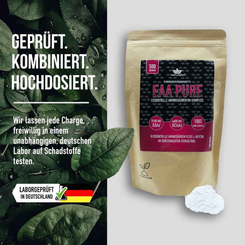 - German laboratory: For your health, we have every batch of our EAA powder extensively tested for harmful substances such as bacteria and heavy metals in an independent and accredited German laboratory. This guarantees us and you purity and quality.