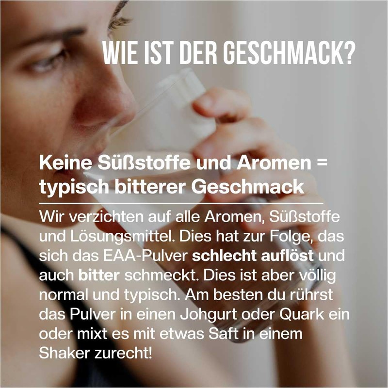 - ✅ Free from all additives, including flavours, sweeteners and solvents. As a result, it does not dissolve well in water and also taste quite bitter. If you are looking for a pure product without additives and you don't care about the taste, then EAA Pure is just the thing.