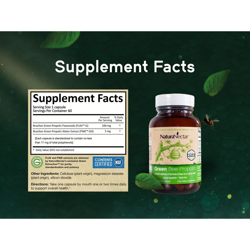 - NSF CONTENTS CERTIFIED: NaturaNectar Green Bee Propolis is the FIRST and so far only Brazilian Green Propolis certified to the American National Standard NSF/ANSI 173 for dietary supplements. These propolis capsules ensure purity, safety, and accurate labeling. Free from ethanol, propylene glycol, and harsh chemicals, these capsules are gluten-free and solvent-free, verified by NSF International. Enhances overall well-being with the powerful benefits of flavonoids and polyphenols.
