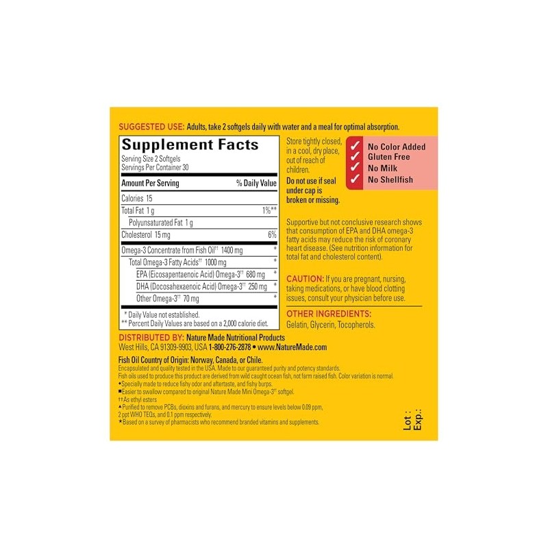 - Brain, Eye and Heart supplement: contains one 60 count bottle of Nature Made Extra Strength Burp Less Omega-3 (1) from Fish Oil 1400 mg per serving Minis Softgels for a 30-day supply
