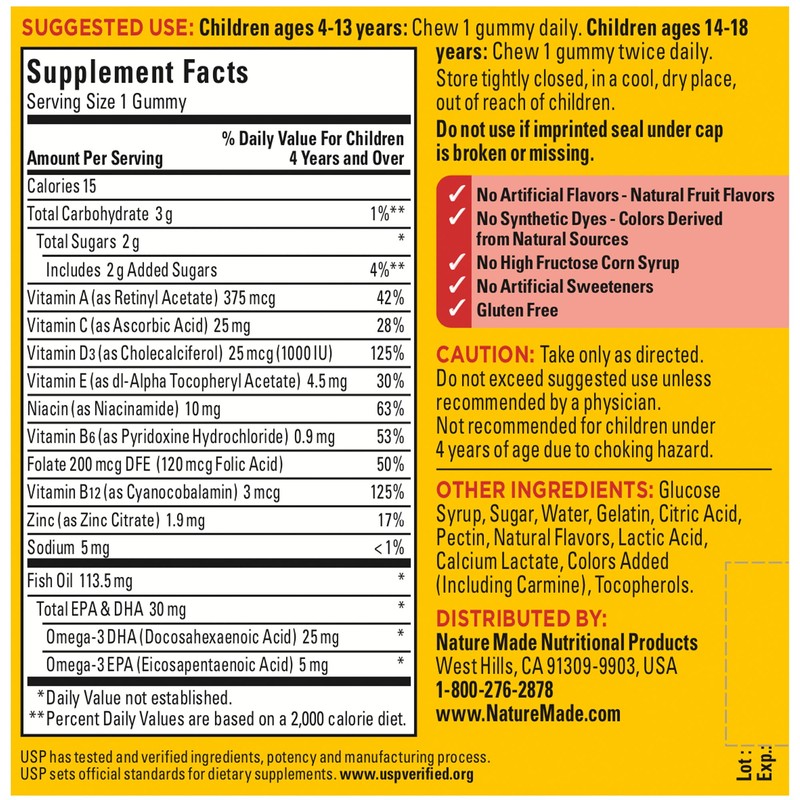 - Children ages 4-13 chew one of these Nature Made multi gummies daily, and children ages 14-18 chew one of these kids multivitamin with Omega 3 gummies twice daily