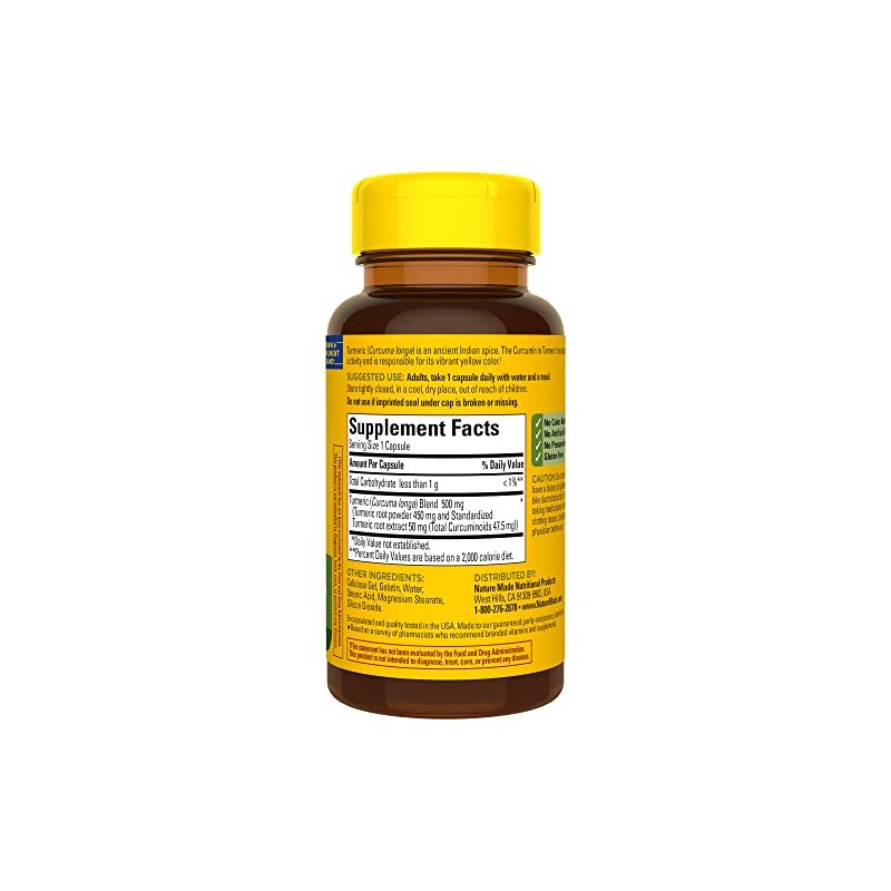 Product DescriptionNature Made Turmeric Curcumin 500 mg Capsules are herbal supplements that provide antioxidant benefits for the body. Sourced from high quality ingredients, these gluten free Turmeric Curcumin supplements have no artificial flavors, no color added, and no preservatives. Turmeric is an Indian spice that has been traditionally used for its health properties. This Turmeric supplement is made with standardized Turmeric extract and gets its vibrant yellow color from Curcumin (and some other curcuminoids), which provides antioxidant activity to help neutralize free radicals in the body. These Turmeric 500mg capsules are perfect for those looking for antioxidant benefits. Adults, take one of these Turmeric 500 mg capsules daily with water and a meal. Store these Tumeric supplements tightly closed, in a cool, dry place, out of reach of children. Nature Made supplements are quality you can trust. USP has tested and verified ingredients, potency and manufacturing process. USP sets official standards for dietary supplements. Visit the USP verified website for more information. *Based on a survey of pharmacists who recommend branded vitamins and supplements.Brand StoryBy Nature Made