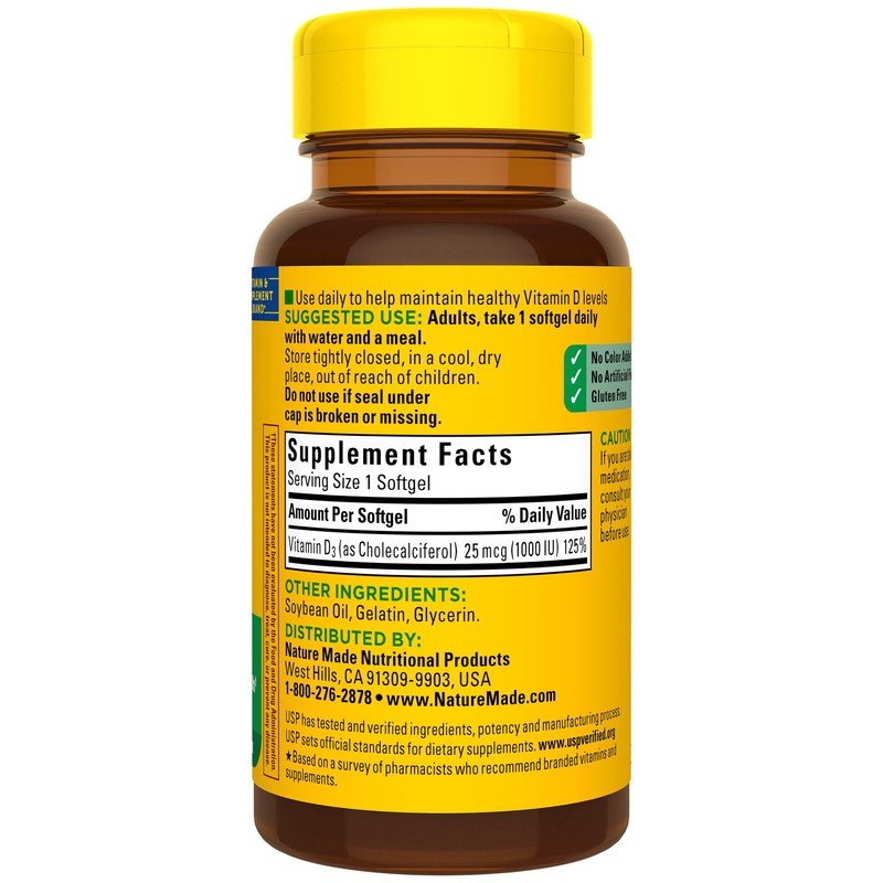 - Suplemento de apoyo para la salud inmunológica, muscular, dental y hueso: contiene una botella de 100 unidades de Nature Made Vitamin D3 1000 UI (25 mcg) cápsulas blandas para un suministro de 100 días