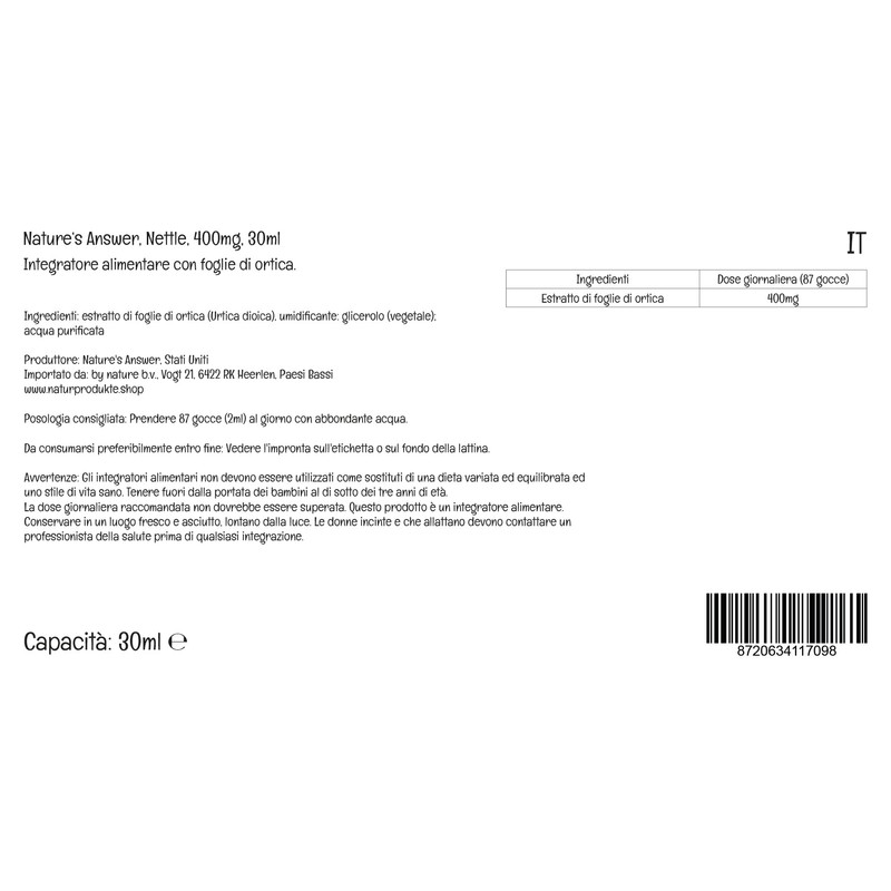 - HIGH-DOSAGE: One dose, 87 drops, of Nettle Extract from Nature's Answer contains 400mg of nettle extract that you can give your body every day