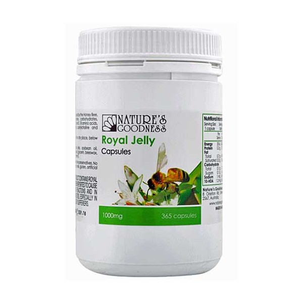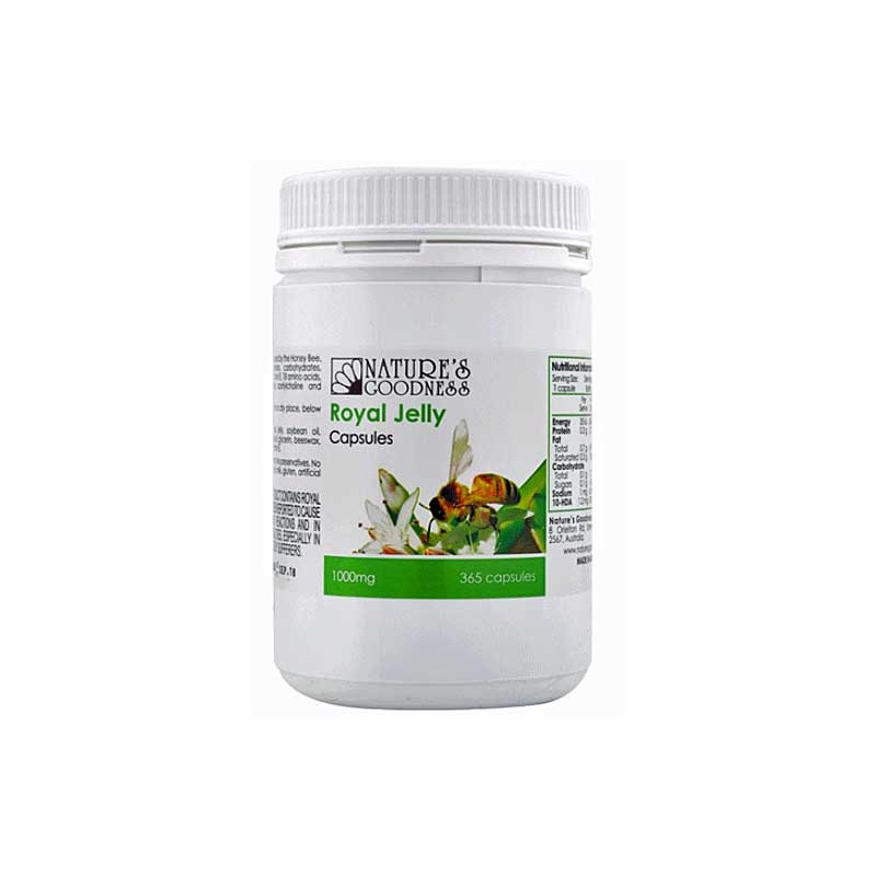 Natures Goodness Royal Jelly 1000mg 365 CapsulesRoyal Jelly is a nutrient produced by the Honey Bee. It is rich in proteins, carbohydrates, viatmins A, C, D, E and the B group. It also contains 18 aminoacids, 18 enzymes, minerals, acetylcholine and 10 Hydroxy Decenoic Acid.