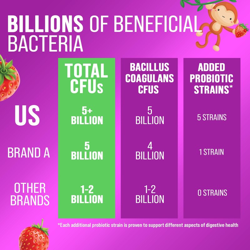 - Powerful Kids Probiotic: 5 billion CFUs and 4 types of lactobacillus; strong probiotics for digestive health support