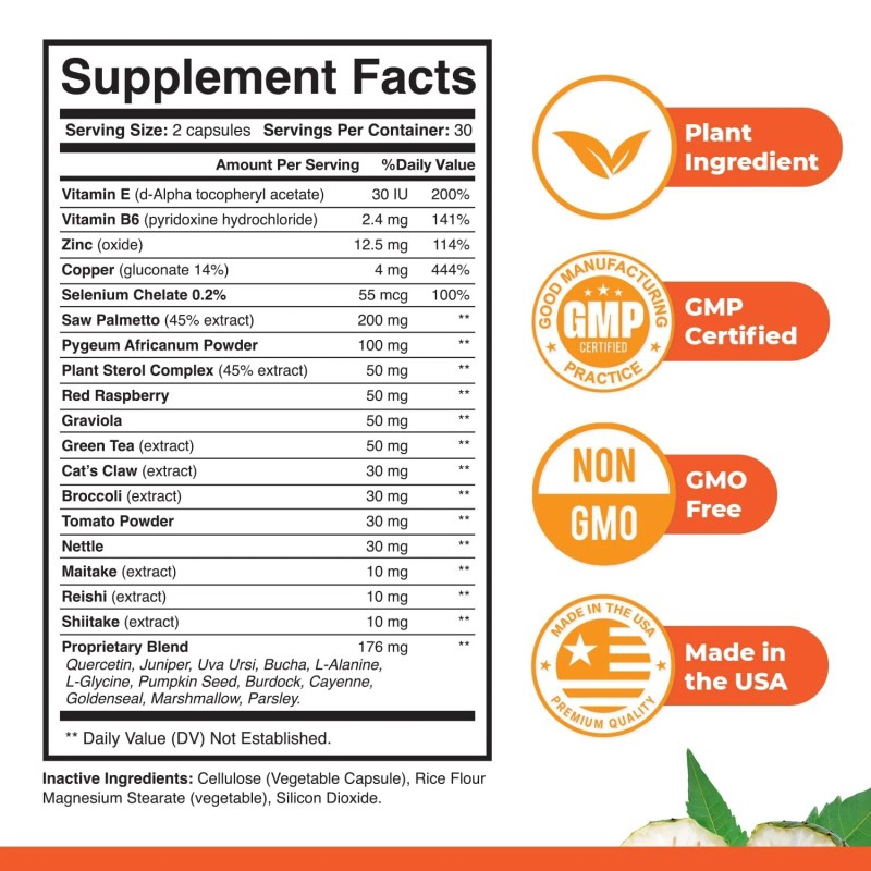 - Vitamin Mineral and Herbal Prostate Formula - We believe any effective prostate supplement should feature a variety of beneficial ingredients including Saw Palmetto for men, zinc, vitamin E, B6 and Selenium Pygeum for prostate health.