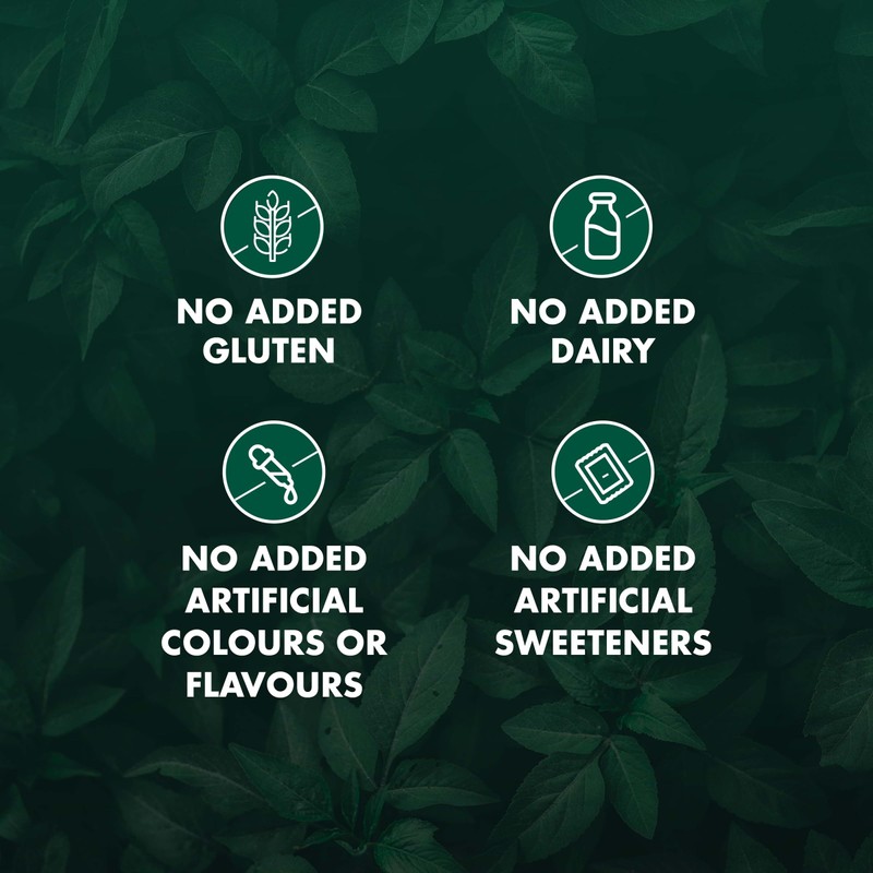 - Contains no added gluten, lactose, artificial colours, artificial flavours, artificial sweeteners, or dairy products