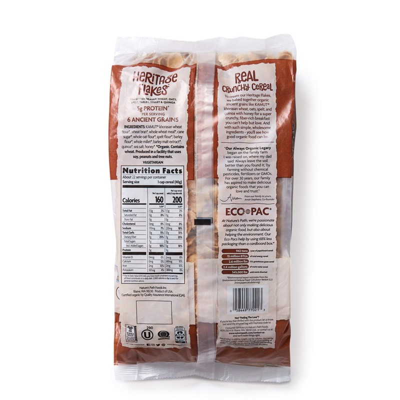 - Contains 6- 2 Pound Earth Friendly Bags of Nature’s Path Organic Heritage Flakes Cereal. Our larger, recyclable Ecopac bags use 66% less packaging than a cardboard box. Rated best cereal on taste and nutrition of Best Breakfast Cereals from Consumer Reports January 2022