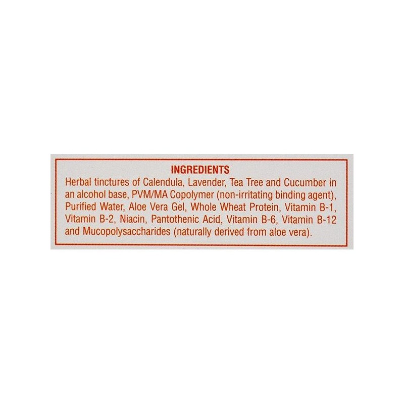 SD alcohol 40B, purified water, PVM/MA copolymer (pure, non-irritating binding agent), calendula (calendula officinalis) extract, lavender (lavandula angustifolia) extract, tea tree (melaleuca alternifolia) oil and cucumber (cucumis sativus) extract, aloe vera (aloe barbadensis) (supplying naturally occurring mucopolysaccharides) extract, hydrolyzed wheat protein, vitamin B1 (thiamin HCl), vitamin B2 (riboflavin), niacin, silk amino acids, vitamin B12 (cobalamin), panthenol, vitamin B6 (pyridoxine HCl), pantothenic acid, fragrance.
